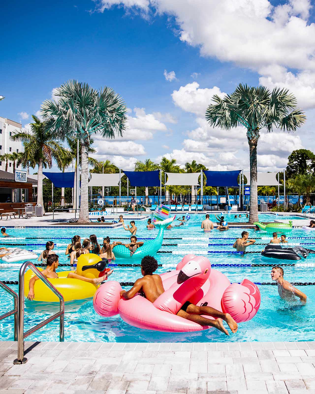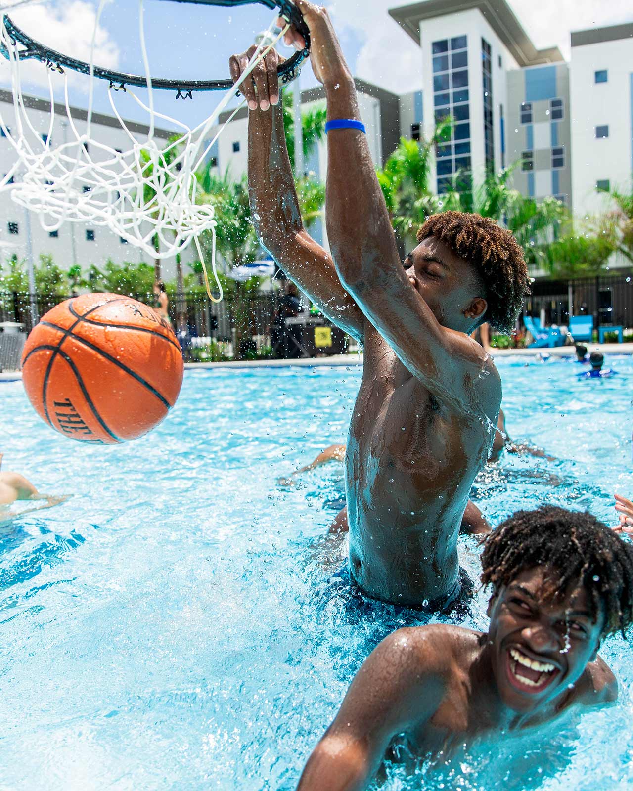 All campers also have the chance to unwind and hang out between camp programming sessions. The rec area between the residence halls includes a resort-style pool (with lifeguard), sand volleyball court, basketball courts, turf sport court, table tennis, and more. Other activities are planned, including movie nights on the pool jumbotron, pool parties and Campus Center activities.